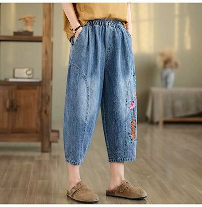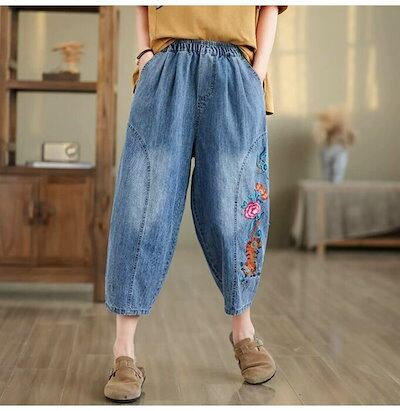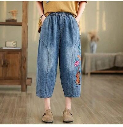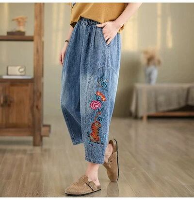 デニムパンツ パンツ テーパードパンツ レディース 刺繍 大人可愛い ハイライズパンツ ロング ボトムス 下着 半端丈 パンツ ワイド ロールアップ ノアール サルエル コットン 大きいサイズ ゆった | koookooo