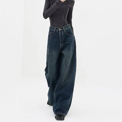 ラッキーボックス デニムパンツ アメリカンスタイル レトロ ダークカラー ストレート ジーンズ レディース 24新作 大きいサイズ ルーズ 百掛け ワイドパンツ 韓国
