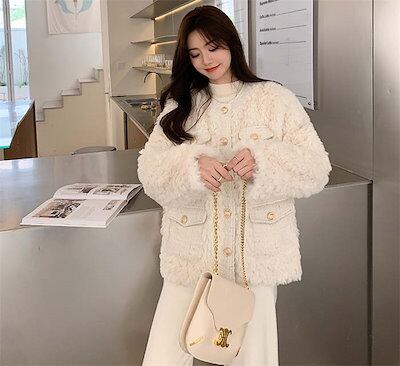 ボアジャケット ノーカラジャケット レディース ツイード風 春 秋 冬 ノーカラー ポケット 羽織 ブルゾン コート アウター ボア フリース 金ボタン 秋冬 カジュアル もこもこ オフィス OL | koookooo