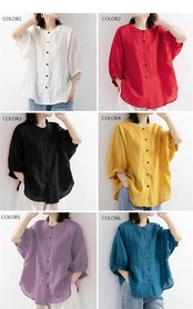 シャツ レディース 綿 麻 ボタン おしゃれ リネンシャツ 半袖シャツ 立ち襟 五分袖 バールン袖 フリル ドルマンスリーブ ドロップショルダ とろみ 春夏 トップス シャツ 大きいサイズ ゆったり | koookooo