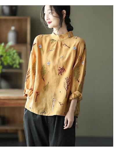 長袖シャツ リネンシャツ 綿麻シャツ シャツブラウス 刺繍 レディース トップス リバーシブル 通気性 バック開き ボタン留め 春秋 カジュアル 30代 40代