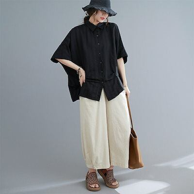 シャツ レディース 半袖 夏 白 黒 おしゃれ 五分袖 黒シャツ 白シャツ ゆったり ドルマンスリーブ シャツブラウス ドロップショルダ とろみ 折り襟 開襟 トップス 春 夏 秋 リブー ボタン 前 | koookooo