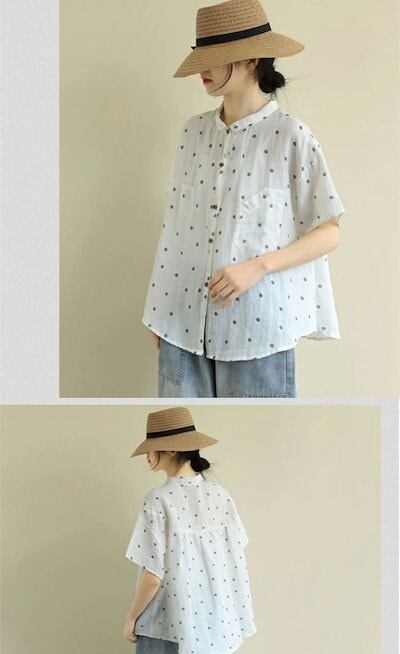 シャツ レディース 夏 綿 トップス 半袖 総柄 水玉柄 襟付き コットン 柔らか ゆったりシャツ 薄手 シャツブラウス 前開き ボタン留め 通気性 着痩せ 体型カバー 大きいサイズ | koookooo