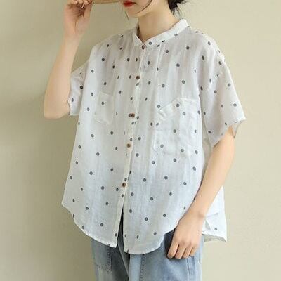 シャツ レディース 夏 綿 トップス 半袖 ブラウス 襟付き 総柄 水玉柄 襟 コットン 柔らか ゆったり 半袖シャツ 薄手 シャツブラウス 前開き ボタン留め 通気性 着痩せ 体型カバー 大きいサイ | koookooo