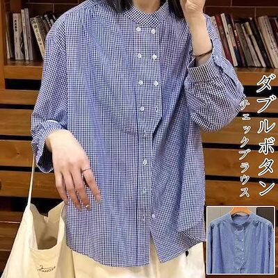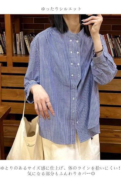 チェック シャツ レディース 長袖 チュニック ブラウス バンドカラー 綿 シャツブラウス トップス 春 夏 秋 長袖シャツ チェック柄 チェックシャツ 前後差 綿シャツ ダブルボタン 大きいサイズ | koookooo