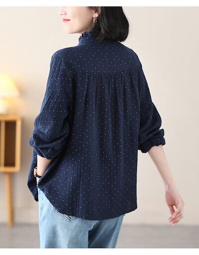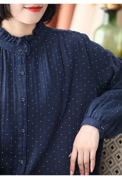 ブラウス レディース おしゃれ シャツ 長袖 立ち襟 シャツブラウス ドット柄 トップス ゆる 綿 コットンシャツ ふんわり 柔らかい 長袖シャツ バルーンスリーブ フリル 襟 水玉 前開き ボタン止 | koookooo