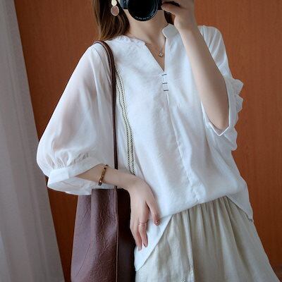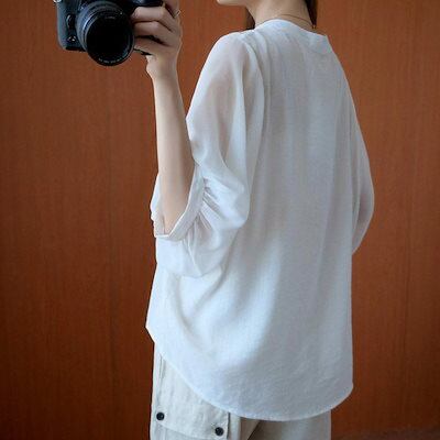 シャツ ブラウス レディース トップス シャツブラウス 白シャツ ホワイトシャツ 7分袖 半袖 tシャツ 春 チュニック ゆったり ドルマンスリーブ 無地 vネック スキッパー 切替 大きいサイズ ゆ | koookooo