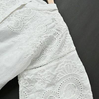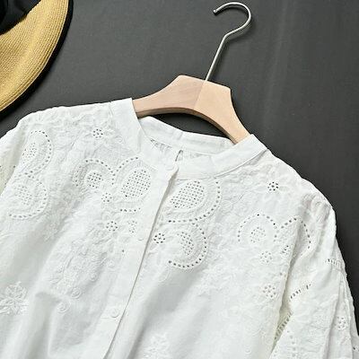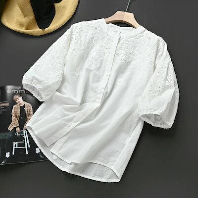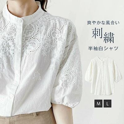白 シャツ レディース 半袖 白 ブラウス 刺繍 花柄 シャツ ボリューム袖 春 秋 夏 ブラウス 上品 トップス 五分袖 ゆったり オシャレ 韓国風 大人 コットン 綿 カジュアル 体型カバー ビッ | koookooo