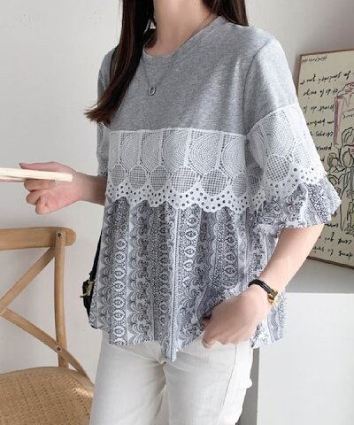 Tシャツ レディース 春 夏 秋 レース切り替え 花柄 半袖 Tシャツ トップス フェミニン 着回し シンプル おしゃれ 大人 カジュアル こなれ感 ゆったり シンプル ゆったり 女性らしい 着?せ | koookooo