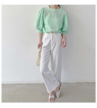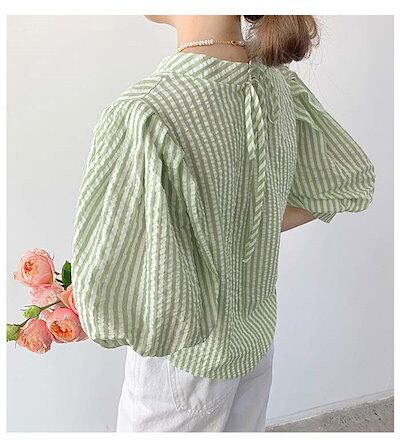 ブラウス レディース エンボス加工 半袖 ボリューム袖 トップス とろみシャツ おしゃれ 春 夏 秋 Tシャツ ストライプ 無地 フェミニン 着回し 体型カバー ゆったり シンプル おしゃれ 大人 カ | koookooo