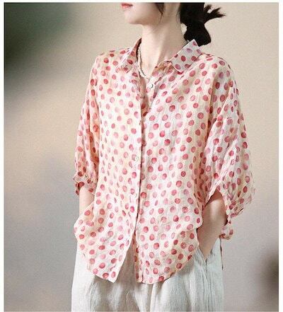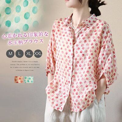 ドット シャツ ブラウス レディース 水玉柄 チュニック シャツ ブラウス リネン コットン ドルマンスリーブ 綿麻風 カーディガン 透け感 五分袖 トップス パフスリーブ 森ガール キレイめ 春 夏 | koookooo