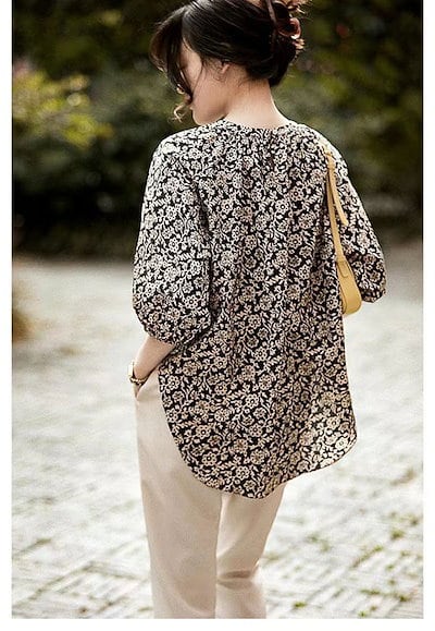 ブラウス レディース 七分袖 トップス ゆったり シャツ プルオーバー 5分袖 チュニック ロングtシャツ バルーンスリーブ 大きいサイズ ゆったり 春夏 大人可愛い きれいめ 体型カバー 総柄 | koookooo