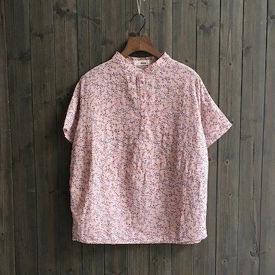 シャツ 半袖 スタンドカラー シャツ レディース 半袖 綿 スウェット コットン トップス カジュアル 春 夏 秋 柔らかい 大人 かわいい ナチュラル 総柄 キレイめ 白 ライトブルー ネイビー イ | koookooo