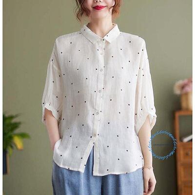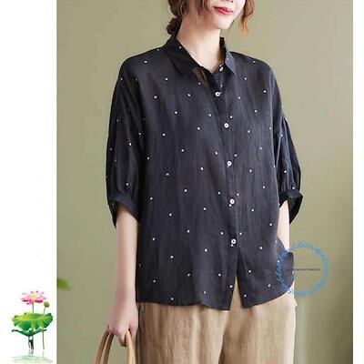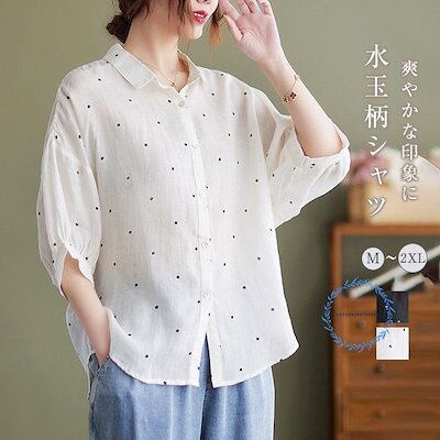 【3月新品】シャツ ブラウス レディース 春 秋 7分袖 水玉柄 半袖 綿麻 ベーシック コットンリネン 着回し シンプル おしゃれ 大人 カジュアル