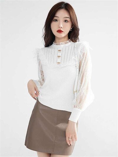 カットソー レディース プルオーバー トップス 春 秋 冬 長袖 ハイネック ショット丈 無地 ニット 透け感 インナー フリル セーター レース切り替え シンプル 着痩せ キレイめ 花柄レース カジ | koookooo