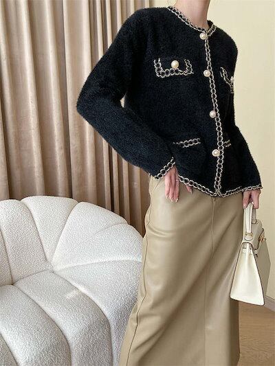 カーディガン ボレロ レディース 長袖 ノーカラー ニット パールボタン ジャケット アウター ノーカラージャケット ツイードカーディガン 春 秋 冬 ショート丈 丸首 無地 生地 きれいめ ツイード | koookooo