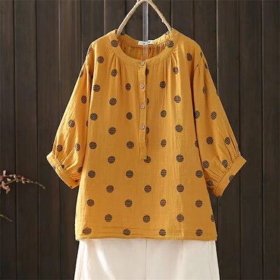 シャツ ガーゼシャツ レディース 春夏 ガーゼ シャツブラウス 五分袖 ブラウス 立ち襟 ドット柄 トップス 綿シャツ コットン ナチュラル ゆったり 大きいサイズ 体型カバー 着?せ 大人可愛い | koookooo