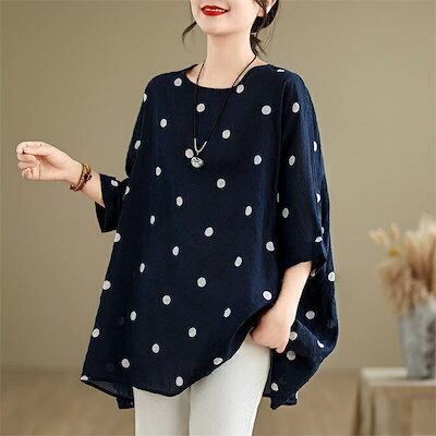 Tシャツ トップス レディース ブラウス 春夏 綿麻tシャツ ドット柄 七分袖 総柄 クルーネック 丸首 ノーカラー ゆったり 体型カバー 着?せ カジュアル おしゃれ きれいめ 春 夏 可愛い オフ | koookooo