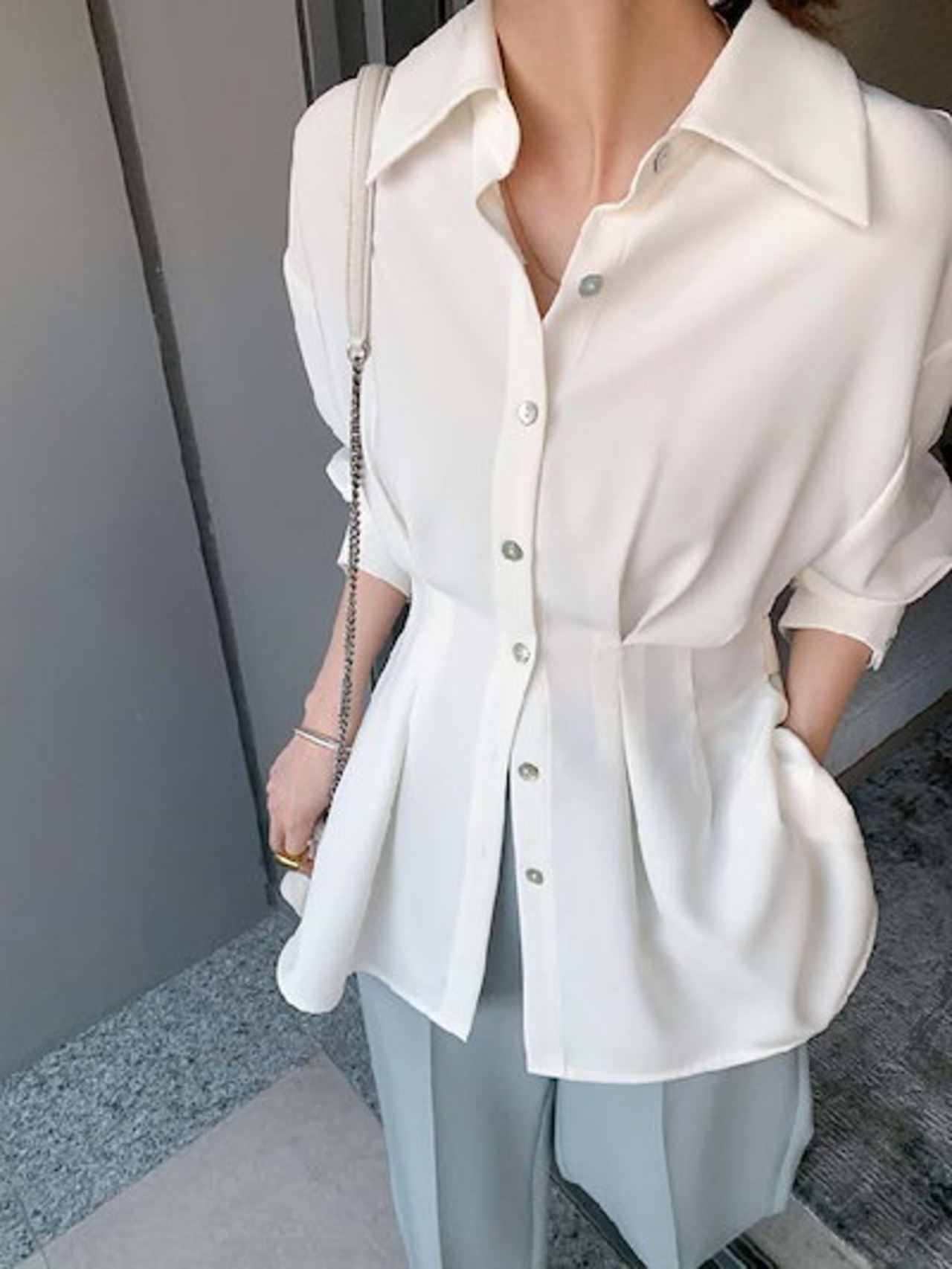 シャツ レディース 長袖 バックプリーツ シャツ ブラウス 春 秋 トップス 無地 薄手 プリーツ シャツ Aライン フェミニン 着回し シンプル おしゃれ 大人 カジュアル こなれ感 ゆったり 体型 | koookooo