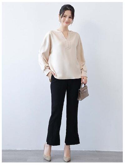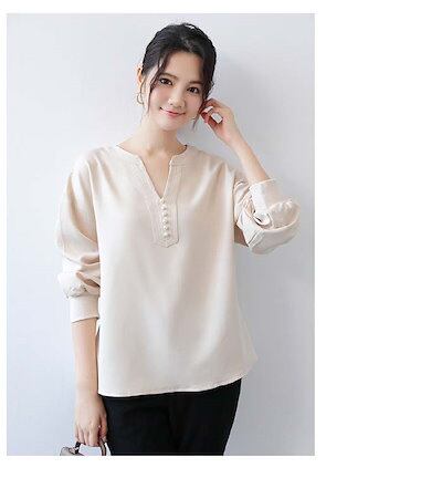 ブラウス レディース パール付き 長袖 春 秋 キーネック トップス シャツ Tシャツ フェミニン 着回し シンプル おしゃれ 大人 カジュアル こなれ感 春 女性らしい 着?せ 大きいサイズ きれい | koookooo