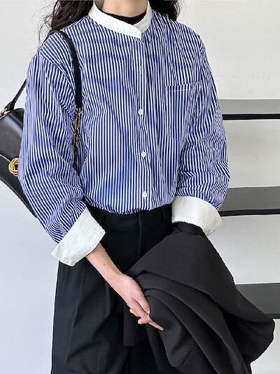シャツ ブラウス レディース ストライプ シャツ 春 夏 秋 スタンドカラー トップス 半袖 フェミニン 着回し シンプル おしゃれ 大人 カジュアル こなれ感 春 夏 上品 オフィス フォーマル ビ | koookooo