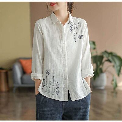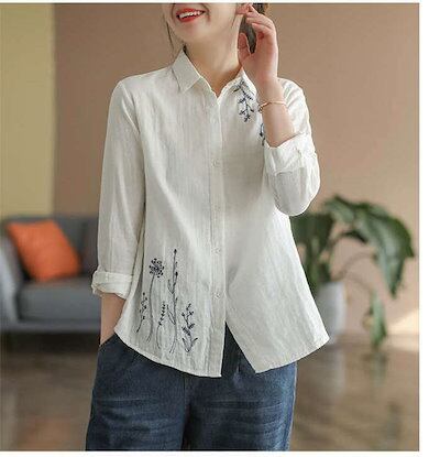 ブラウス シャツ 刺? リネン レディース 秋 春 長袖 綿麻 ゆったり オシャレ シンプル カジュアル 着回し 体型カバー ゆったり 花柄刺? ベーシックシャツ