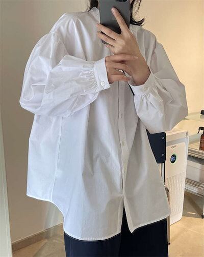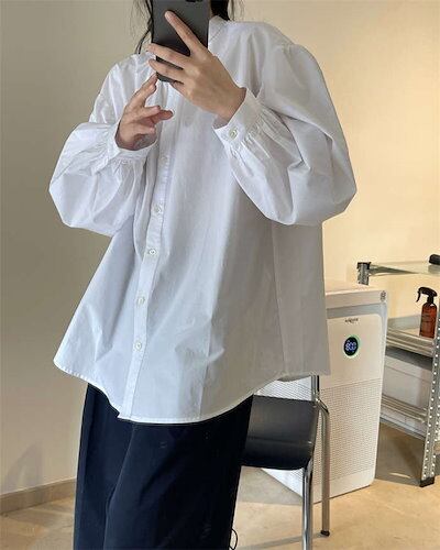 シャツ レディース 秋 春 ブラウス 長袖 大きいサイズ バンドカラー ボリューム感 無地 ゆる シャツ ゆったり オシャレ シンプル パフ袖 カジュアル 着回し ビッグシルエット 体型カバー オフィ | koookooo