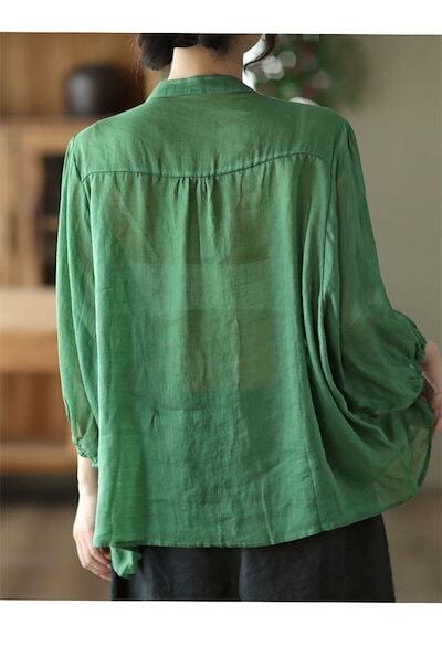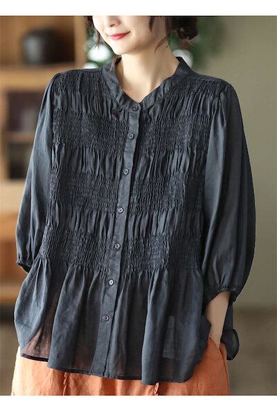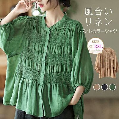シャツ ブラウス レディース 春秋 長袖 ドルマン 綿 麻 ボリューム袖 バンドカラー プリーツ シャツ リネン 大きいサイズ ゆったり 春 夏 秋 オシャレ シンプル カジュアル 着回し 体型カバー | koookooo