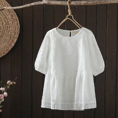 シャツ ブラウス レディース レース 花柄 刺? 半袖 春 夏 秋 カットワーク トップス フェミニン 着回し シンプル おしゃれ 大人 カジュアル こなれ感 ゆったり ボリューム感 女性らしい 着? | koookooo