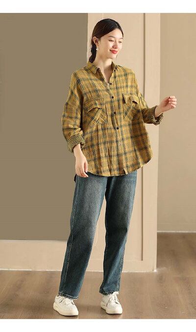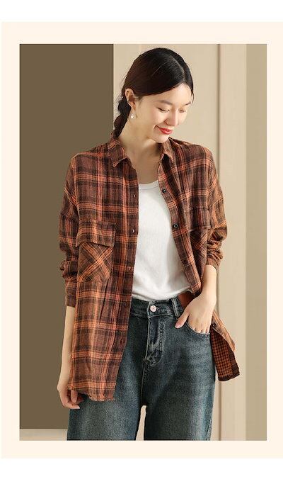 シャツ チェック柄 レディース 大きいサイズ 秋 春 長袖 綿麻 シャツ リネン コットン 羽織り 長袖 シャツ 綿麻 体型カバー 着痩せ ビッグシルエット シンプル カジュアル 薄手 | koookooo