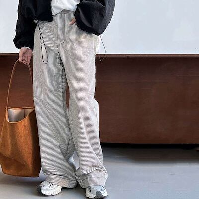 パンツ ワイドパンツ レディース ストライプ柄 春 秋 冬 長ズボン ロング丈 チノパンツ ポケット付き タックパンツ シンプル 柄パンツ 綿 コットン ゆったり 体型カバー ボトムス ストレート 個 | koookooo