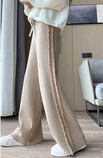 リブニット 伸縮性 リラックス ボトムス ニット ウエストゴム 美脚 ワイドパンツ レディース フレアパンツ 無地 ゆるパンツ 春 楽ちん ストレートパンツ リブ タッセル 秋冬 秋 冬 ロングパンツ | koookooo