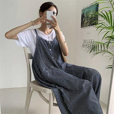 サロペット オーバーオール パンツ レディース ロング丈 ワイドパンツ 春夏 新作 ロングズボン ボーダー柄 大きいサイズ オシャレ ボトムス 着痩せ