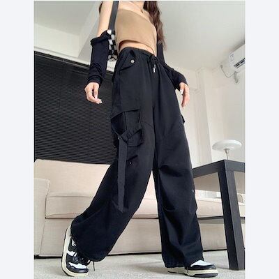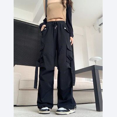 ブラック カーゴパンツ レディー 韓国 ハイウエスト ズボン ストレート カジュアルパンツ