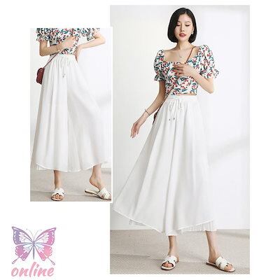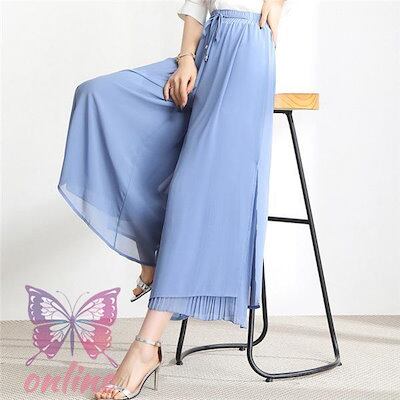 安価ガウチョパンツ ワイドパンツ レディース シフォン 裾プリーツ フレアパンツ ガウチョ パンツ ボトムス スカーチョ ゆったり シフォンガウチョパンツ