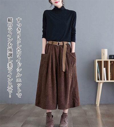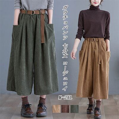 コーデュロイパンツ レディース 秋冬 ガウチョパンツ コーデュロイ 七分丈 パンツ ウエストゴム ポケット付き ベルト付き カジュアルパンツ シンプル レトロ ワイドパンツ ゆったり あったか ロング | koookooo