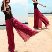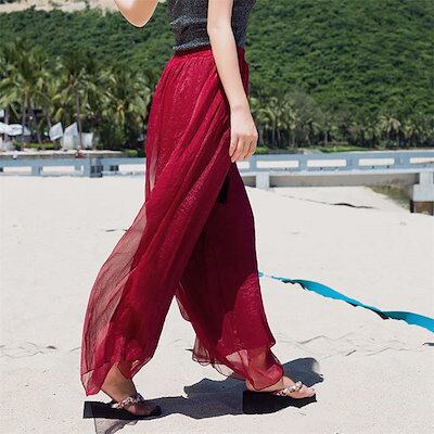 ワイドパンツ レディース ガウチョパンツ パンツ ロング丈 ウエストゴム シフォン 春 夏 無地 透け感 薄手 ボトムス 涼しい サマーパンツ レイヤード イージーパンツ 重ね着風 体型カバー シアー | koookooo