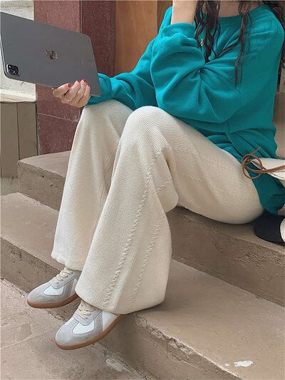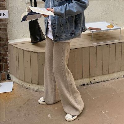 ワイドパンツ レディース ニットパンツ 春 秋 ニット パンツ ロング丈 レディースガウチョパンツ ニットパンツ 無地 キレイめ ハイウエスト 美脚 ケーブル編み ロングパンツ コーデ シンプル | koookooo