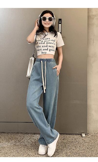 ワイドパンツ レディース デニム パンツ ウエストゴム デニム 接触冷感 春 夏 ひんやり UVカット 無地 薄手 涼しい ロング丈 ストレート パンツ ジーンズ ゆる パンツ ガウチョ 体型カバー | koookooo
