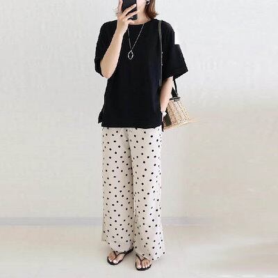 ワイドパンツ レディース 春 夏 ドット柄 ボトムス ロング丈 パンツ ガウチョパンツ ガウチョ ロングパンツ 水玉柄 きれいめ 大きいサイズ ウエストゴム 涼しい 楽ちん ゆったり ドット 着?せ | koookooo