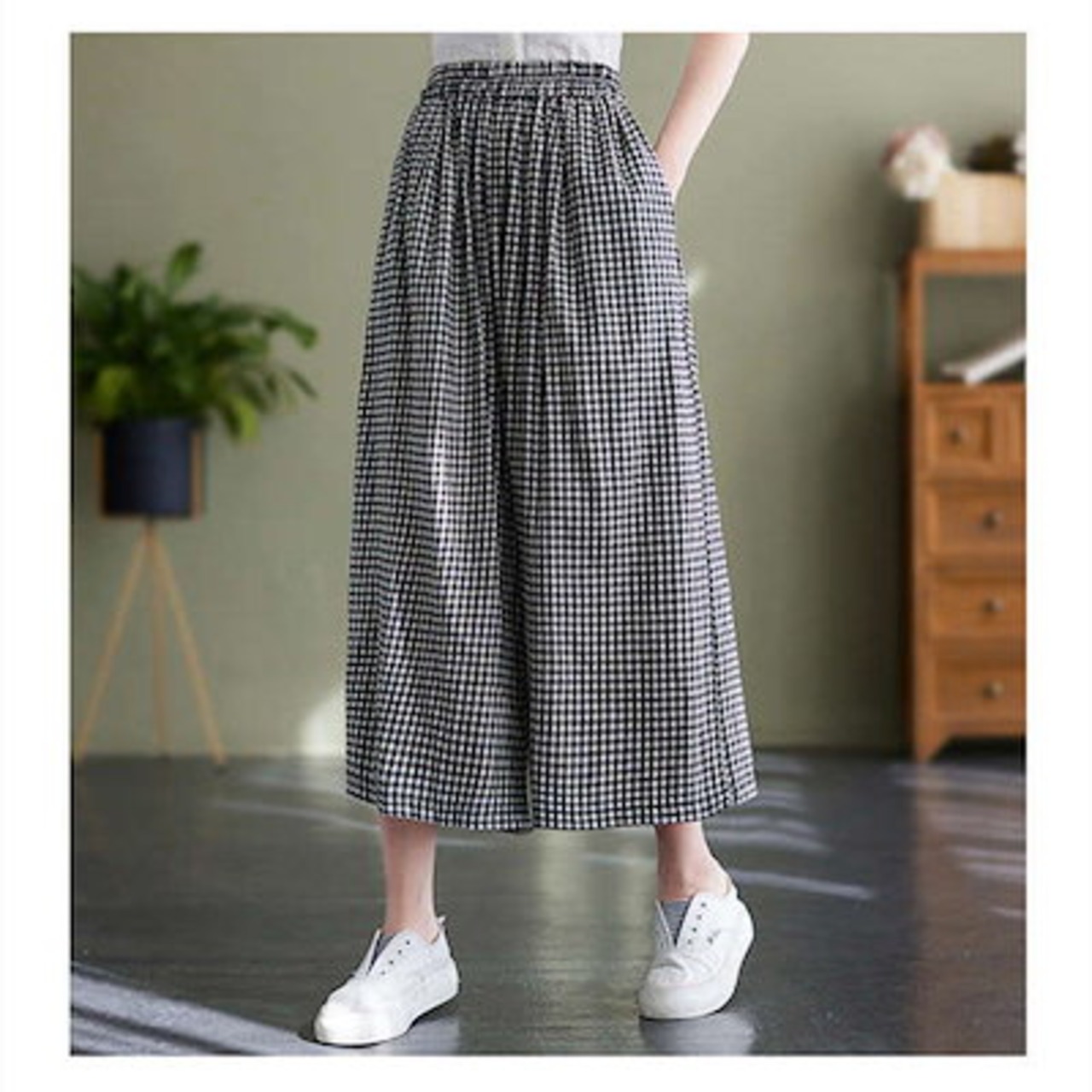 ワイドパンツ レディース チェック柄 春 夏 綿麻 9分丈 ガウチョパンツ リネン コットン 体型カバー おしゃれ ゆったり カジュアル ナチュラル カジュアル 着痩せ ボトムス 春物 春 夏 秋 ゆ | koookooo
