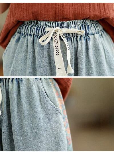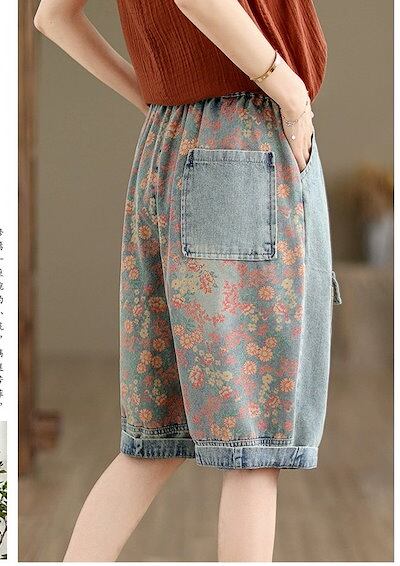 ハーフパンツ ショートパンツ 夏 デニム デニムパンツ レディース 切替え 花柄 ワイドパンツ きれいめ ガウチョパンツ スカーチョ バギーパンツ 大きいサイズ カジュアル ウエストゴム 大人 ボトム | koookooo