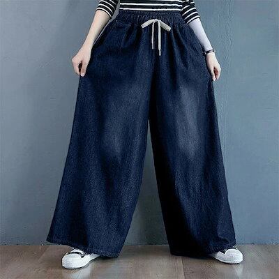 デニム レディース ジーンズ ストーンウォッシュ ワイドパンツ 極太 デニムワイドパンツ ジーパン バギーパンツ お洒落 体型カバー ロングパンツ ウエストゴム ブルー ブラック ワイドジーンズ ワイ | koookooo