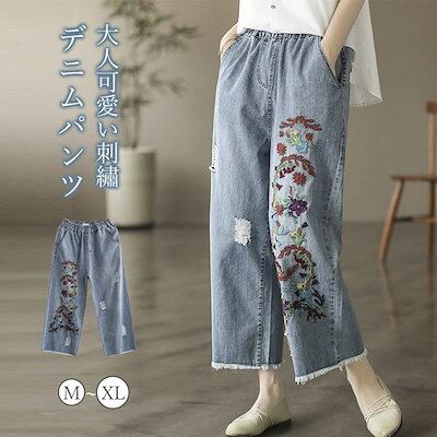 デニムパンツ レディース ストレートパンツ 9分丈 ジーパン ウエストゴム 体型カバー ゆったり ワイドパンツ 刺? 美脚 柔らか バギー ボトムス 春 夏 秋 カジュアル ナチュラル カジュアル 大 | koookooo