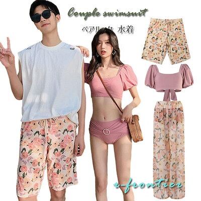 ペア水着 カップルお揃い セパレート パレオ付き 体型カバー 露出控えめ ペア水着 半袖トップス インナーパンツ 3点セット レディース メンズ 男性用 ビーチパン