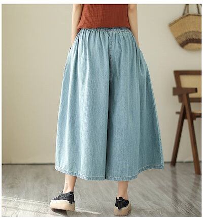 デニムパンツ ワイドパンツ レディース デニム パンツ ウエストゴム ロング丈 無地 ガウチョパンツ タック ポケット付き ボトムス 体型カバー スカーチョ ゆったり ロングパンツ フレア カジュアル | koookooo