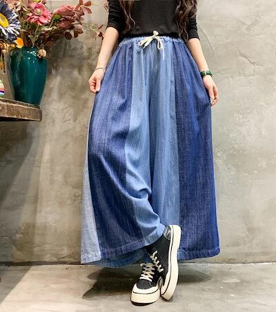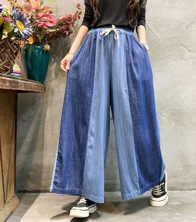 デニム パンツ レディース ワイドパンツ 切り替え きれいめ デニムパンツ 夏 ワイド ゆったり ズボン 長ズボン ボトムス フレアパンツ ウエストゴム 綿 リラックス 楽ちん シンプル ゆったり お | koookooo