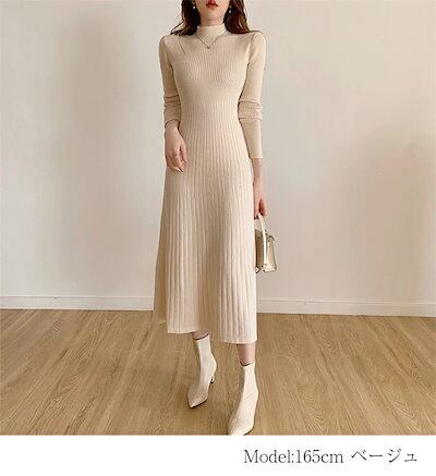 ニットワンピース リブニット ワンピース レディース 秋 冬 長袖 ハイネック リブ ニットフレア ワンピース ロングワンピース マキシワンピース 膝下丈 きれいめ通勤 無地