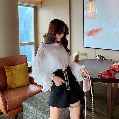 3色長袖 透けシャツ+キャミソール ブラウス 透け感 薄手 フリルデザイン トップス レディース 夏 tシャツ ブラウス 半袖 デザインブラウス シアーシャツ