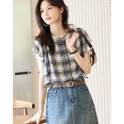 使える!シフォンブラウス 母の日 フリル裾 シアーシャツTシャツ 韓国ファッション ブラウス レディース シフォンシャツ ロングTシャツ 着痩せ シフォン/トップス/tシャツ